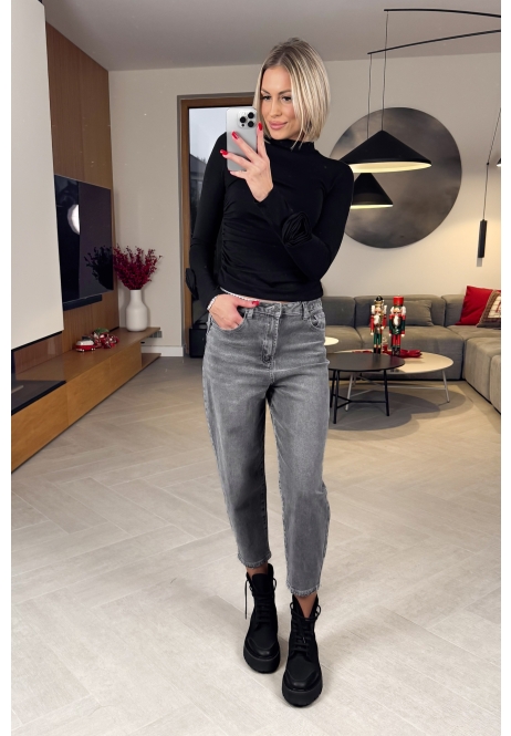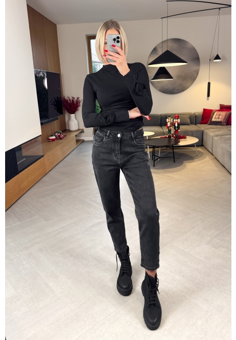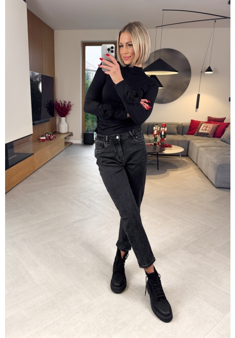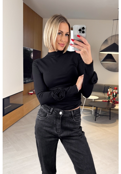 Ta bluzka to prawdziwa mała historia o kobiecości – intensywna czerń, która przyciąga spojrzenia, i subtelna, materiałowa róża przy rękawie, która dodaje całości romantycznego charakteru.