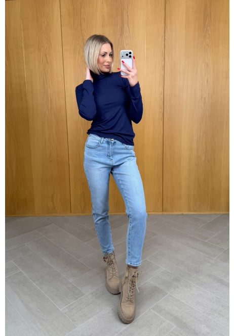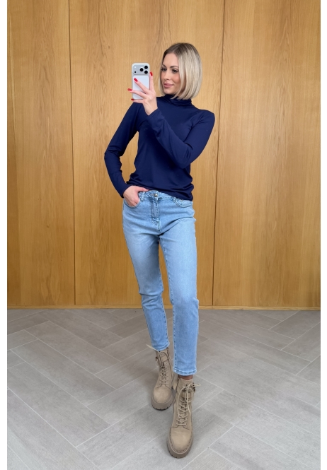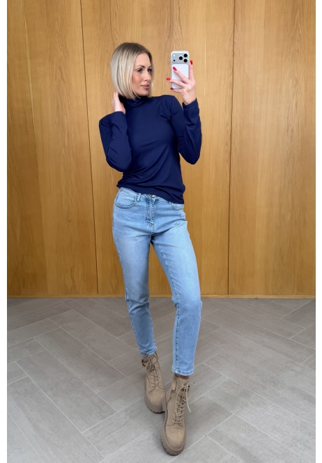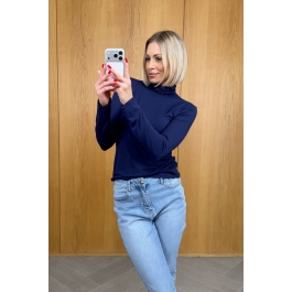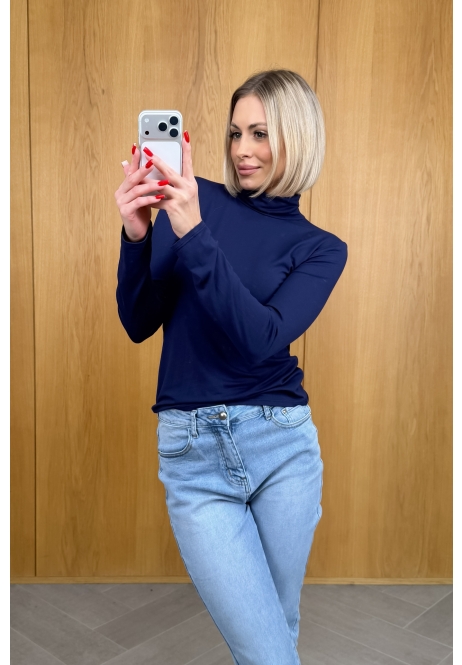 Minimalizm, który robi ogromne wrażenie! Ta granatowa bluzka z długim rękawem i subtelnym półgolfem to idealna baza do wielu stylizacji – zarówno eleganckich, jak i codziennych.