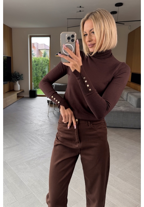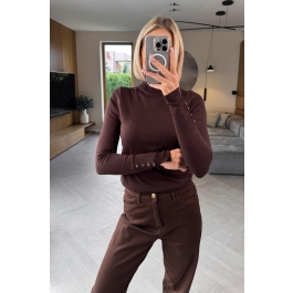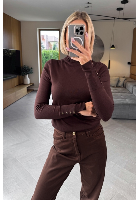 Elegancki i kobiecy sweter w odcieniu brązu . Wykonany z miękkiej, przyjemnej w dotyku dzianiny, która otuli Cię w chłodniejsze dni. Długie rękawy zakończone są subtelnymi, metalicznymi guzikami, dodającymi całości wyjątkowego charakteru .