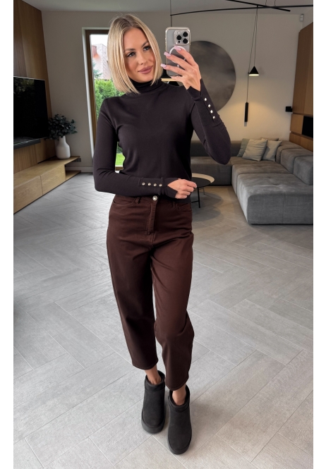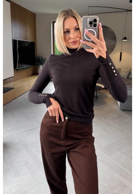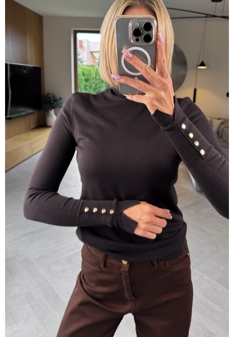 Elegancki i kobiecy sweter w odcieniu brązu . Wykonany z miękkiej, przyjemnej w dotyku dzianiny, która otuli Cię w chłodniejsze dni. Długie rękawy zakończone są subtelnymi, metalicznymi guzikami, dodającymi całości wyjątkowego charakteru .