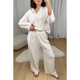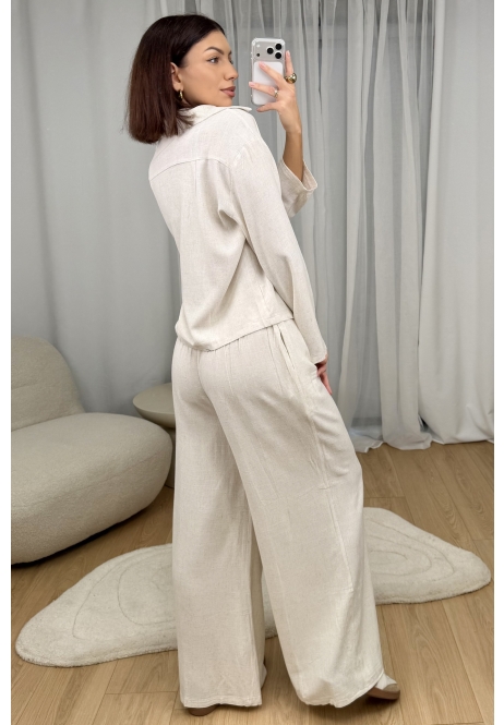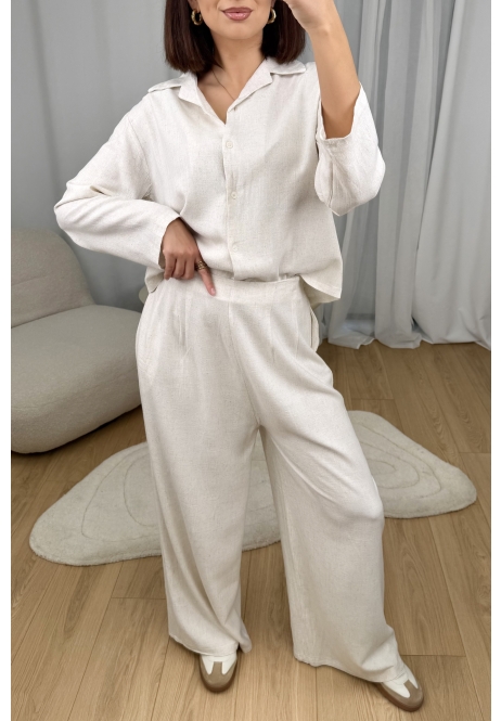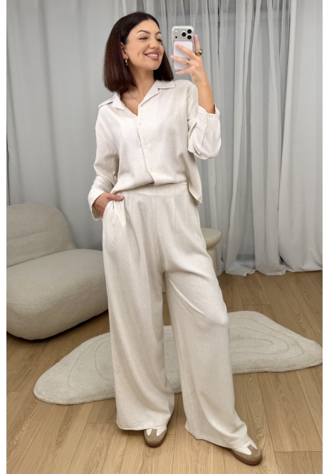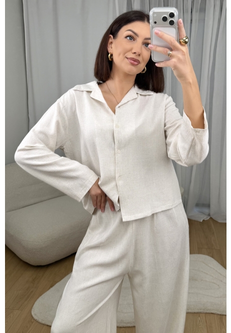 Naturalny, lekki i niezwykle stylowy. Ten komplet składa się z luźnej koszuli z delikatnym kołnierzykiem oraz wygodnych, szerokich spodni, które razem tworzą spójną, minimalistyczną całość.