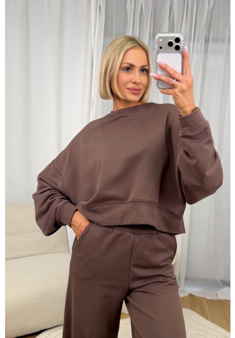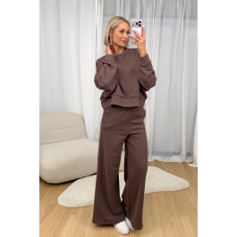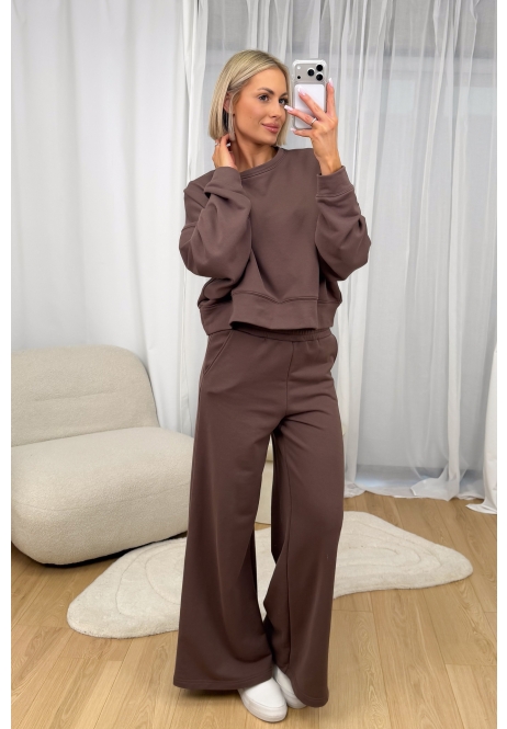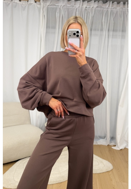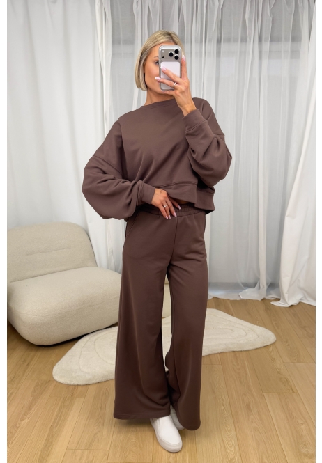 Komplet dresowy w delikatnym, brązowym kolorze, składający się z luźnej bluzy oraz spodni o szerokich nogawkach. Bluza o prostym, swobodnym kroju zapewnia wygodę i lekkość noszenia. Spodnie z elastyczną talią dobrze dopasowują się do sylwetki, jednocześnie nie krępując ruchów. Wykonany z miękkiego, przyjemnego w dotyku materiału, idealny na co dzień, do domu, na spacer lub podróż. Minimalistyczny fason sprawia, że komplet jest uniwersalny i łatwy do stylizacji.