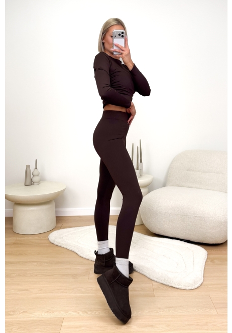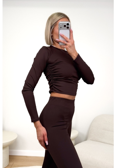 Stylowy komplet w kolorze brązu, składający się z krótkiej bluzki z długim rękawem oraz spodni o prostym, lekko luźnym kroju. Góra o klasycznym, okrągłym dekolcie zapewnia minimalistyczny i nowoczesny wygląd. Spodnie z elastyczną talią gwarantują wygodę noszenia oraz dobre dopasowanie do sylwetki. Komplet wykonany z gładkiego, przyjemnego w dotyku materiału, który miękko układa się na ciele. Doskonały wybór zarówno na co dzień, jak i na bardziej eleganckie, casualowe stylizacje.