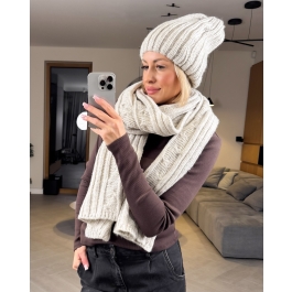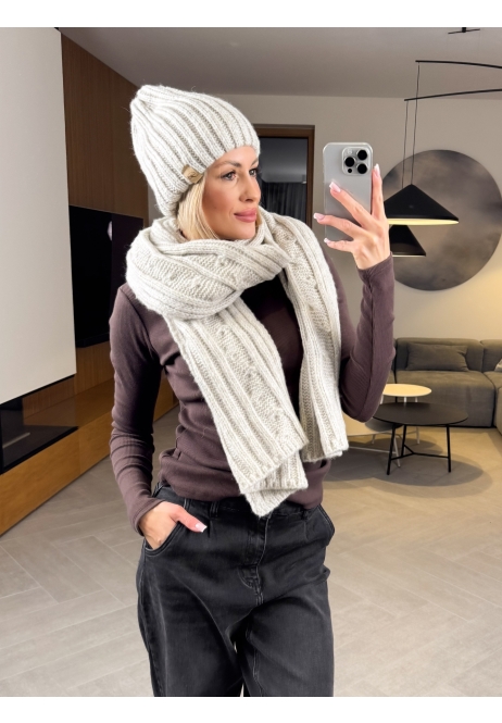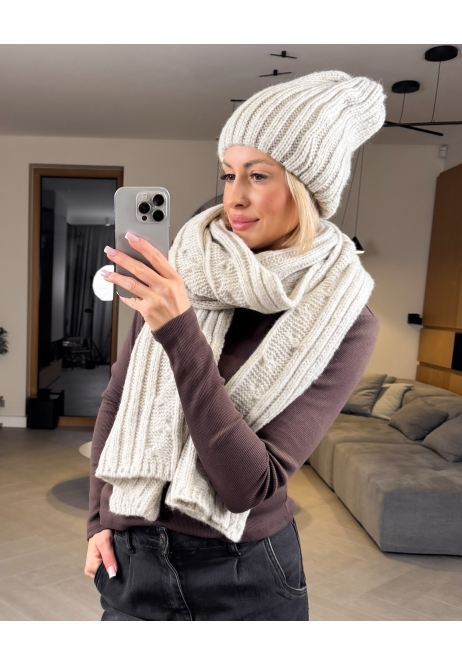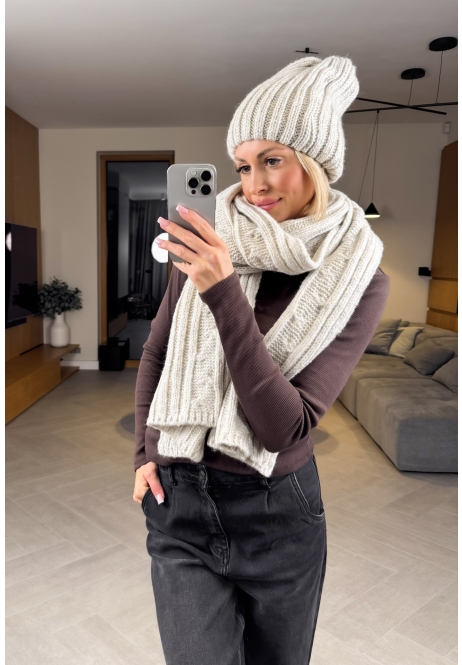 Otul się miękkością! Ten piękny, dziergany komplet w ponadczasowym, beżowym kolorze to idealne połączenie stylu i funkcjonalności. Wygodna czapka o grubym splocie delikatnie dopasowuje się do głowy, zapewniając ciepło nawet w mroźne dni. Do tego długi, otulający szalik, który możesz nosić dokładnie tak, jak lubisz – klasycznie owinięty lub nonszalancko przerzucony przez ramię.