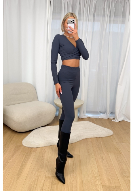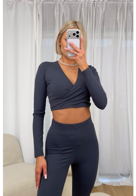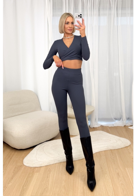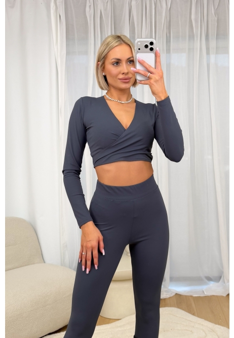 Stylowy komplet w eleganckim, ciemnoniebieskim kolorze, składający się z krótkiej bluzki z długim rękawem oraz dopasowanych spodni. Góra o kopertowym kroju z dekoltem w kształcie litery V subtelnie podkreśla sylwetkę i nadaje całości kobiecego charakteru. Spodnie o prostych nogawkach i elastycznej talii zapewniają wygodę noszenia oraz estetyczne dopasowanie. Wykonany z gładkiego, przyjemnego w dotyku materiału, który dobrze układa się na ciele. Komplet idealny zarówno na eleganckie wyjścia, jak i na stylowe, codzienne zestawy.