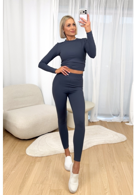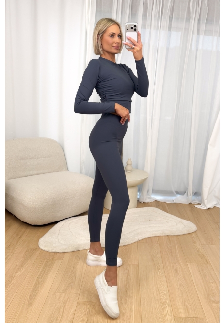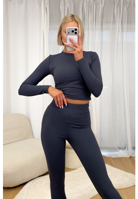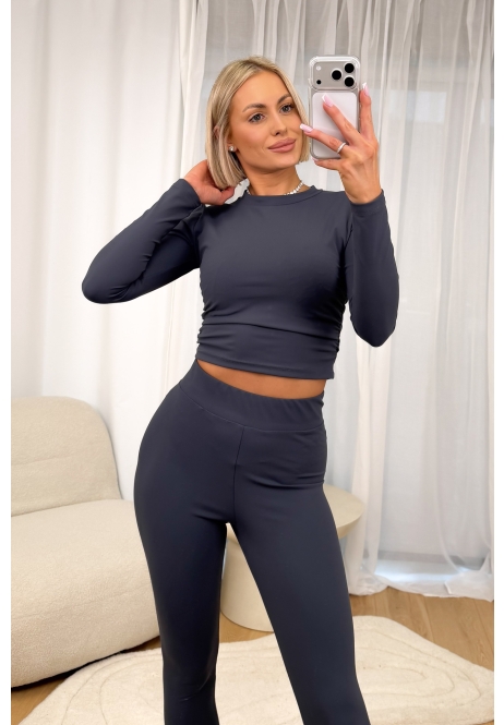 Stylowy komplet w odcieniu grafitu, składający się z krótkiej bluzki z długim rękawem oraz spodni o prostym, lekko luźnym kroju. Góra o klasycznym, okrągłym dekolcie zapewnia minimalistyczny i nowoczesny wygląd. Spodnie z elastyczną talią gwarantują wygodę noszenia oraz dobre dopasowanie do sylwetki. Komplet wykonany z gładkiego, przyjemnego w dotyku materiału, który miękko układa się na ciele. Doskonały wybór zarówno na co dzień, jak i na bardziej eleganckie, casualowe stylizacje.