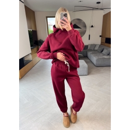 Poznaj nasz bestsellerowy komplet Snugly w eleganckim odcieniu bordo, który pokocha każda miłośniczka wygodnych, ale stylowych rozwiązań. Zestaw składa się z bluza typu hoodie z kapturem oraz spodni baggy z gumką w pasie, które razem tworzą look idealny na chłodniejsze dni.