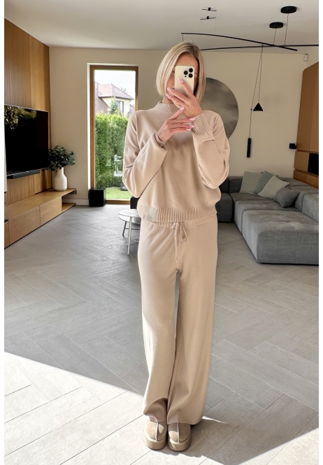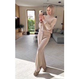 W zestawie znajdziesz sweterek oraz szerokie spodnie z elastyczną gumą w pasie. Całość tworzy perfekcyjny balans między modą a funkcjonalnością.