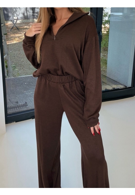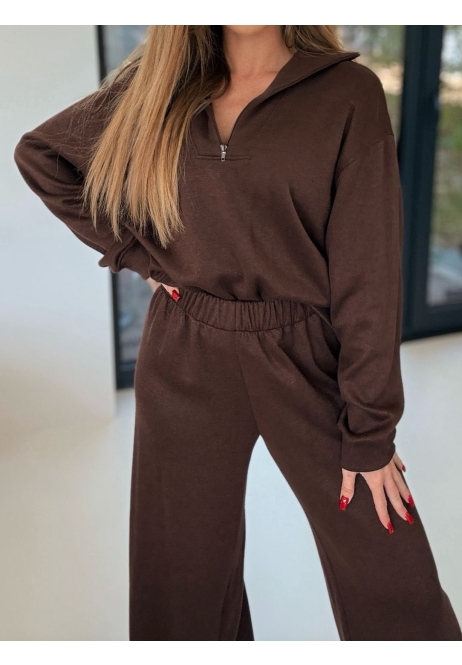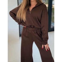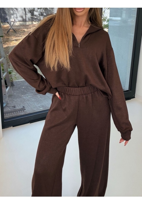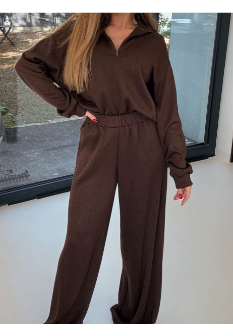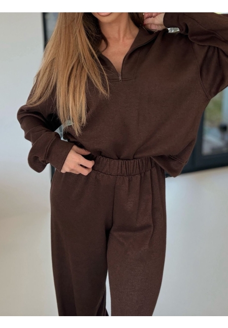 Komplet w głębokim brązie – stylowy i komfortowy, idealny na codzienne stylizacje. Składa się z oversize’owej bluzy z długim rękawem oraz spodni z szeroką nogawką.