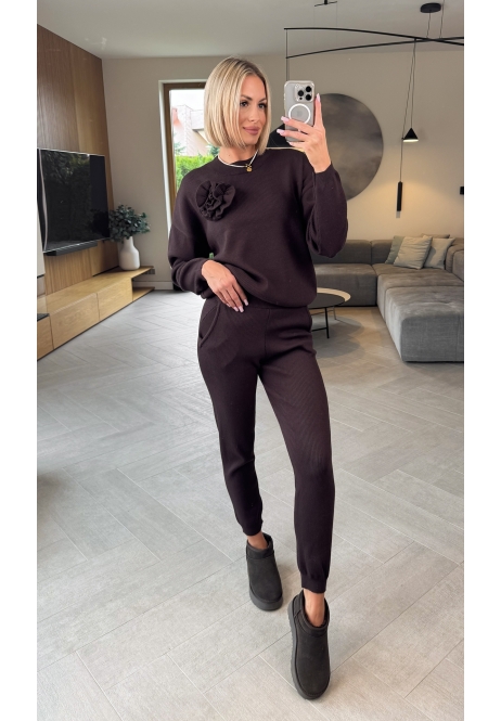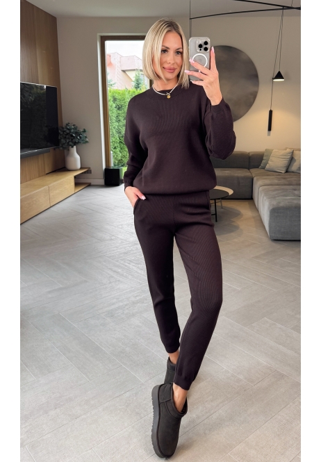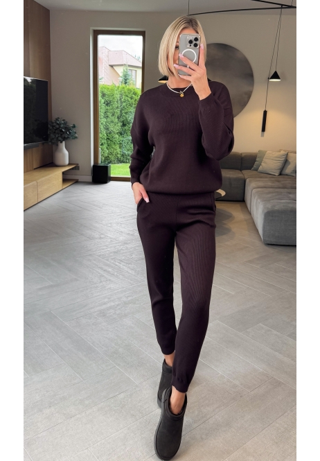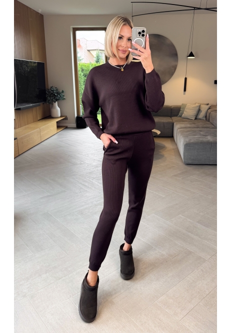 Komplet dresowy w kolorze głębokiego brązu – minimalistyczny, wygodny i ponadczasowy. Składa się z luźnej bluzy z długim rękawem oraz spodni o zwężanych nogawkach.