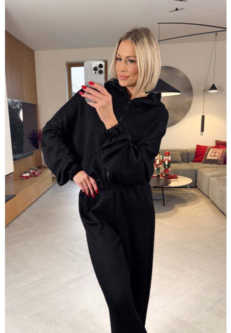 W zestawie znajdziesz krótką, zapinaną na zamek bluzę z kapturem oraz luźne, szerokie spodnie z elastyczną gumą w pasie. Całość tworzy perfekcyjny balans między modą a funkcjonalnością.