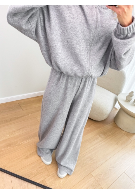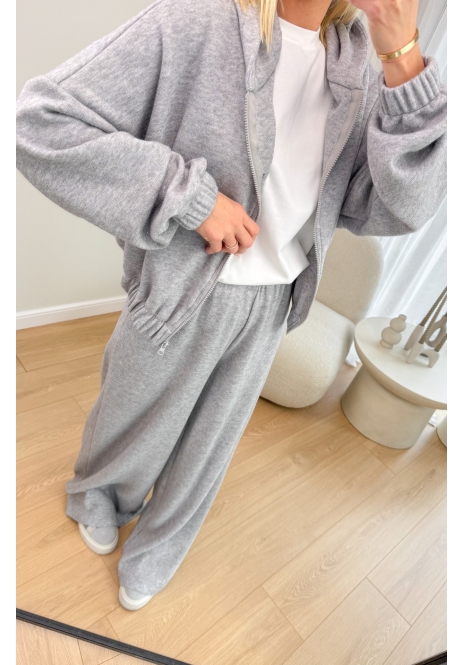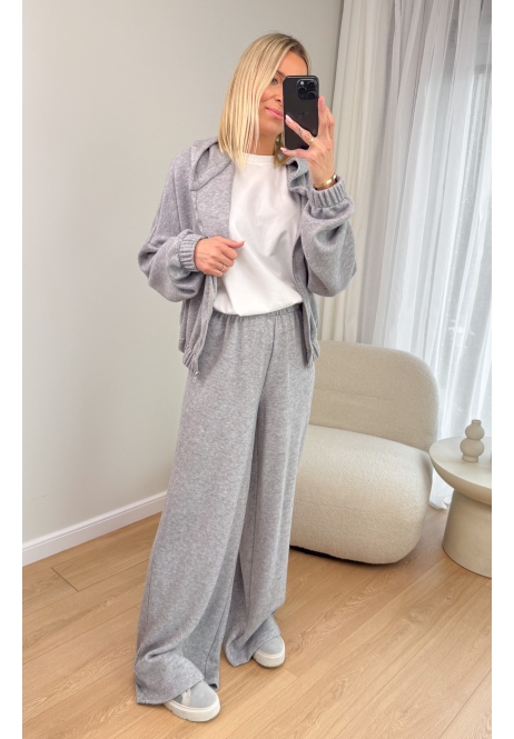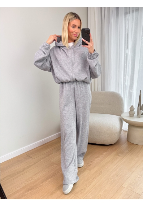 W zestawie znajdziesz krótką, zapinaną na zamek bluzę z kapturem oraz luźne, szerokie spodnie z elastyczną gumą w pasie. Całość tworzy perfekcyjny balans między modą a funkcjonalnością.