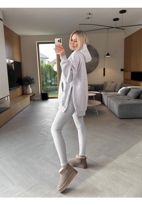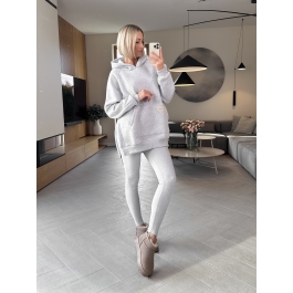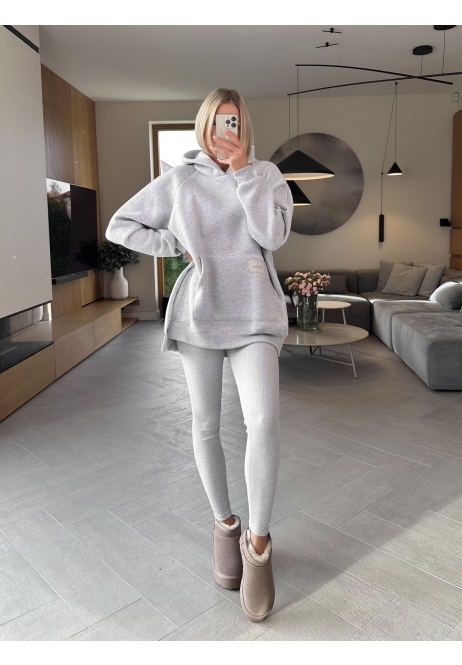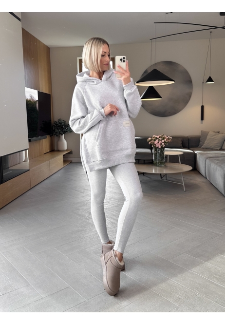 Komplet Mist to klasyka w najlepszym wydaniu: oversize’owa bluza z kapturem i kieszenią typu kangurka + dopasowane legginsy z wysokim stanem i elastyczną gumą w pasie.