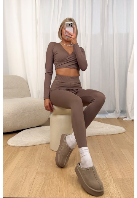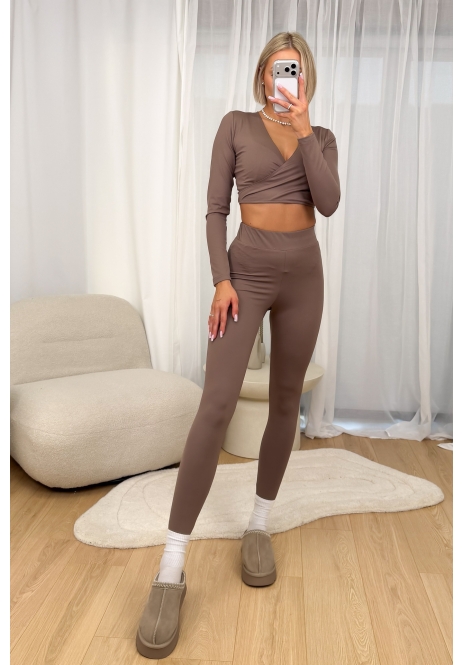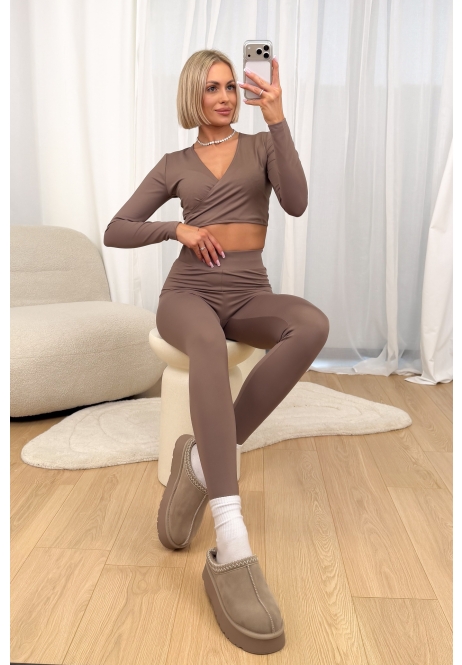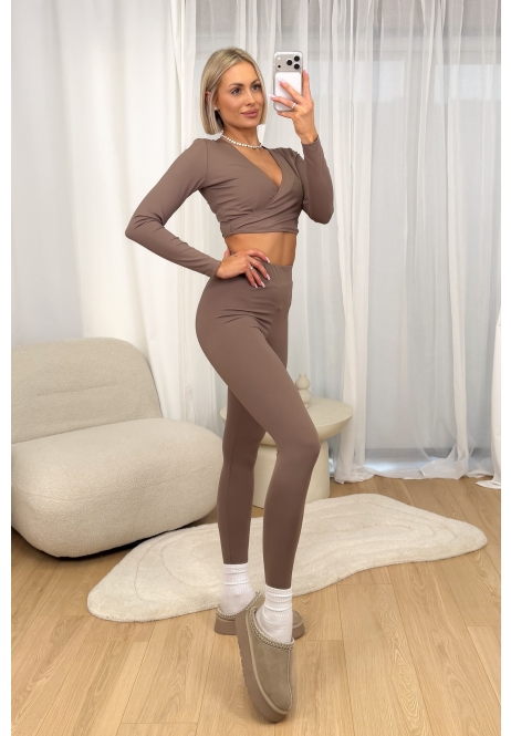 Stylowy komplet w eleganckim kolorze taupe, składający się z krótkiej bluzki z długim rękawem oraz dopasowanych spodni. Góra o kopertowym kroju z dekoltem w kształcie litery V subtelnie podkreśla sylwetkę i nadaje całości kobiecego charakteru. Spodnie o prostych nogawkach i elastycznej talii zapewniają wygodę noszenia oraz estetyczne dopasowanie. Wykonany z gładkiego, przyjemnego w dotyku materiału, który dobrze układa się na ciele. Komplet idealny zarówno na eleganckie wyjścia, jak i na stylowe, codzienne zestawy.