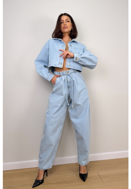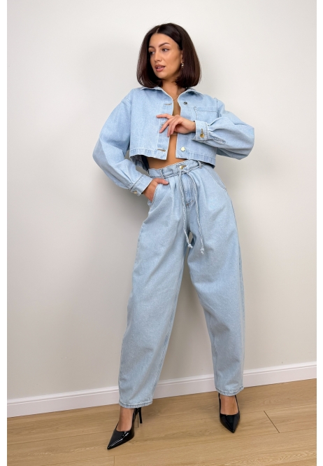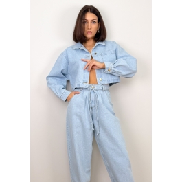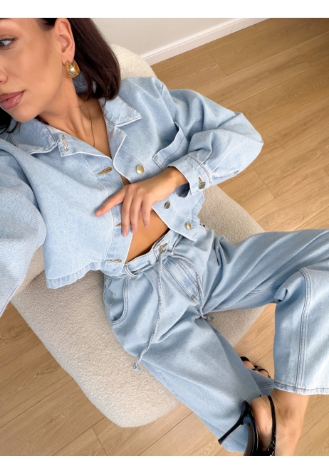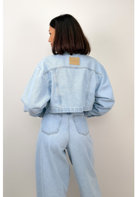 Krótka, jasnoniebieska kurtka o kroju oversize z klasycznym kołnierzem i zapinaniem na guziki. Model z długim rękawem oraz kieszenią na piersi, wykonany z miękkiego materiału o delikatnie spranym efekcie. Świetnie sprawdzi się jako lekka narzutka do codziennych stylizacji – pasuje zarówno do jeansów, jak i sukienki, dodając całości swobodnego, modnego charakteru.