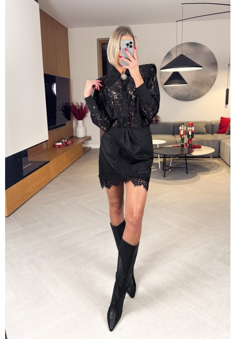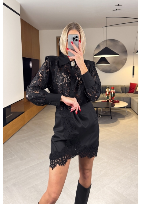 Zachwycająca, pełna klasy czarna koszula wykonana z subtelnej koronki – idealna dla kobiet, które kochają elegancję z nutą tajemniczości. Model posiada gładki, efektowny kołnierz oraz piękną ozdobną broszkę, która dodaje całości luksusowego charakteru.