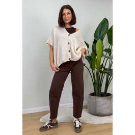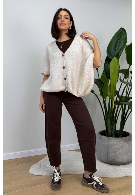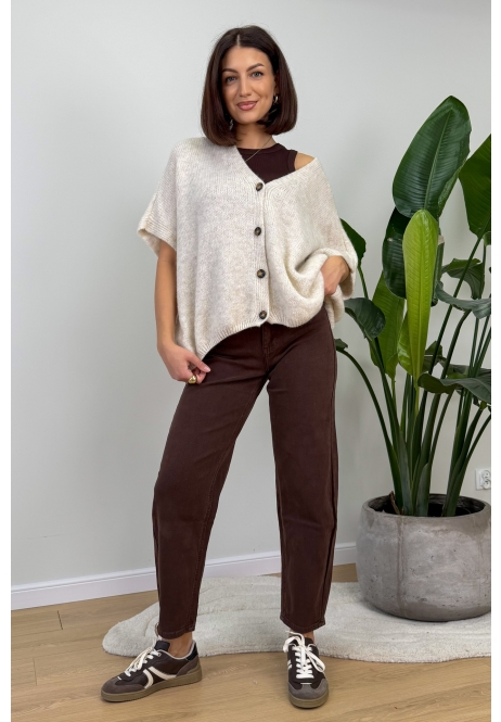 Luźny sweterek w jasnym odcieniu to idealna propozycja na codzienne stylizacje – miękki, wygodny i bardzo kobiecy. Oversize’owy krój pięknie układa się na sylwetce, a asymetryczne zapięcie na guziki dodaje całości nowoczesnego charakteru. Świetnie komponuje się zarówno ze spodniami, jak i spódnicą, tworząc swobodny, ale dopracowany look na co dzień.