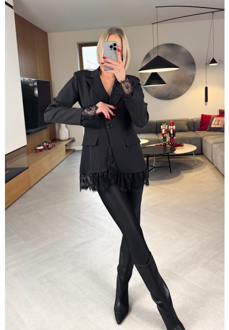 Stylowa, kobieca i wyjątkowa! Marynarka w czarnym kolorze, delikatnie taliowana, dzięki czemu pięknie podkreśla sylwetkę. Klasyczny krój został przełamany efektowną czarną koronką u dołu, która dodaje całości lekkiej, romantycznej nuty.