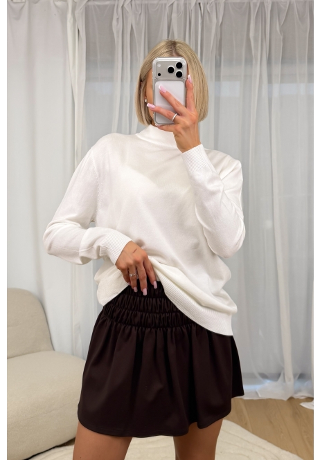 Brązowa spódnica mini o rozkloszowanym kroju, wykonana z lekkiego, miękko układającego się materiału. Model z elastyczną, marszczoną talią, która zapewnia komfort noszenia i łatwe dopasowanie do sylwetki. Prosty, minimalistyczny fason nadaje spódnicy uniwersalny charakter i sprawia, że doskonale sprawdzi się zarówno w codziennych stylizacjach, jak i w bardziej eleganckich zestawach. Idealna do łączenia z dopasowanym topem, koszulą lub swetrem.