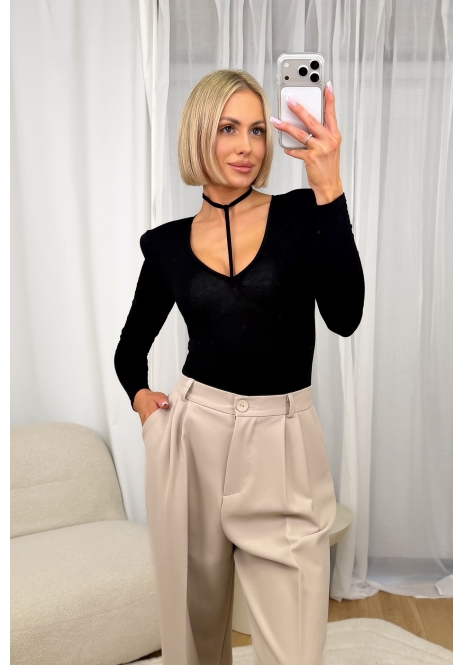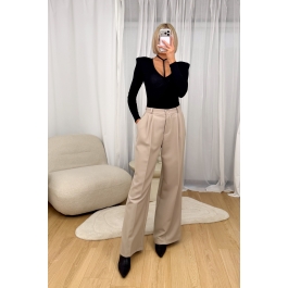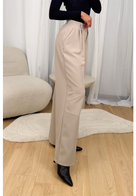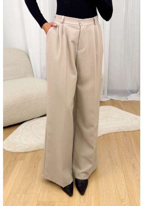 Eleganckie spodnie w kolorze beżowym o szerokim kroju typu palazzo. Wysoki stan z zapięciem na guzik oraz delikatne zakładki z przodu zapewniają estetyczne ułożenie i komfort noszenia. Model wykonany z gładkiego, lejącego materiału, który miękko układa się na sylwetce i nadaje stylizacji lekkości. Spodnie sprawdzą się zarówno w eleganckich zestawach z marynarką, jak i w codziennych stylizacjach z koszulą lub swetrem. Ponadczasowy fason, idealny na każdą porę roku.