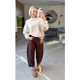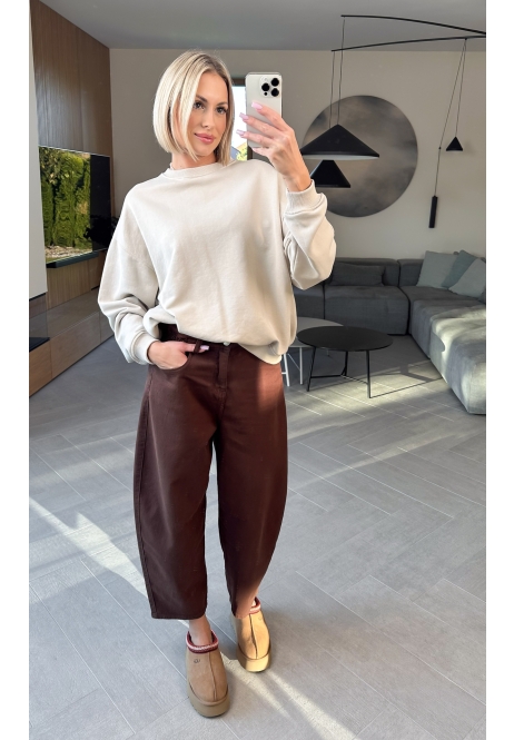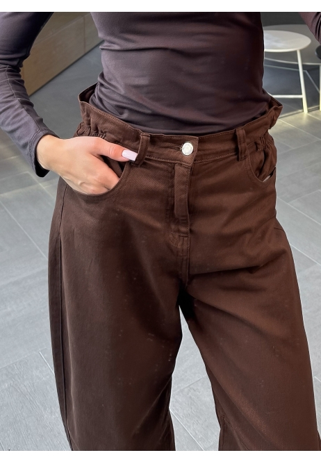 Spodnie Brązowe Paperbag to jeansy o modnym, balonowym kroju z wysokim stanem, które łączą wygodę z nowoczesnym stylem. Wykonane z miękkiego denimu, delikatnie zwężają się ku dołowi, podkreślając talię i nadając sylwetce charakteru.