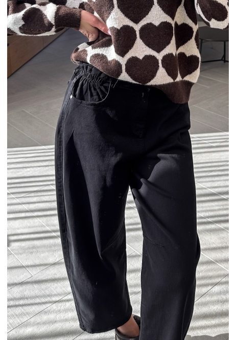 Spodnie Czarne Paperbag to jeansy o modnym, balonowym kroju z wysokim stanem, które łączą wygodę z nowoczesnym stylem. Wykonane z miękkiego denimu, delikatnie zwężają się ku dołowi, podkreślając talię i nadając sylwetce charakteru.