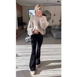 Wysoki stan pięknie podkreśla talię, a szerokie, lekko dzwonowate nogawki optycznie wydłużają sylwetkę i dodają lekkości każdej stylizacji. To idealny wybór zarówno na co dzień, jak i na wieczorne wyjścia – wystarczy zmienić dodatki, aby stworzyć zupełnie inny look