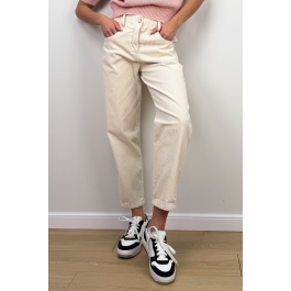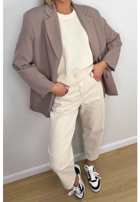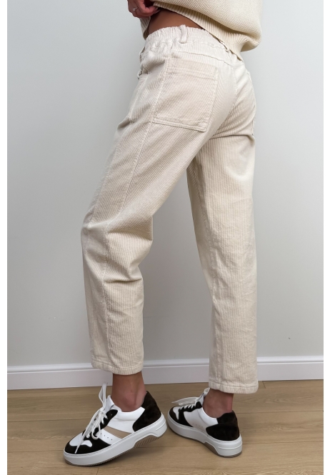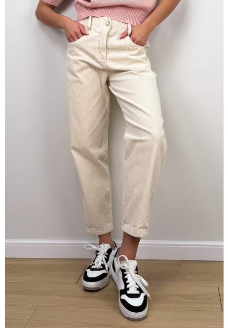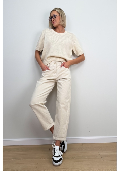 Kremowe spodnie z miękkiego sztruksu o klasycznym, lekko luźnym kroju. Model z wysokim stanem, zapinany na guzik i zamek, z praktycznymi kieszeniami. Materiał jest przyjemny w dotyku i dobrze układa się na sylwetce, dzięki czemu spodnie sprawdzą się zarówno w codziennych stylizacjach, jak i w bardziej uporządkowanych zestawach. Neutralny kolor łatwo łączy się z koszulą, swetrem lub basicowym T-shirtem.