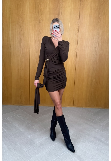 Wyjątkowa sukienka, która podkreśla kobiecą sylwetkę i przyciąga spojrzenia. Model wykonany z elastycznego, miękko układającego się materiału, który pięknie dopasowuje się do ciała. Efektowne marszczenie na całej długości optycznie wysmukla figurę, a ozdobna broszka w talii dodaje szyku i elegancji.