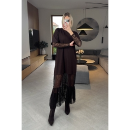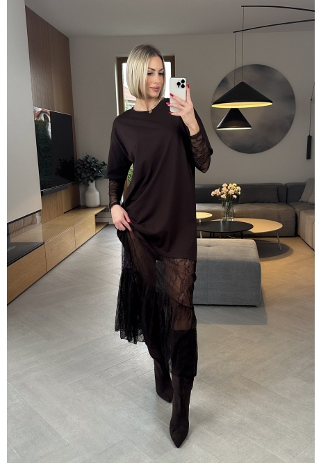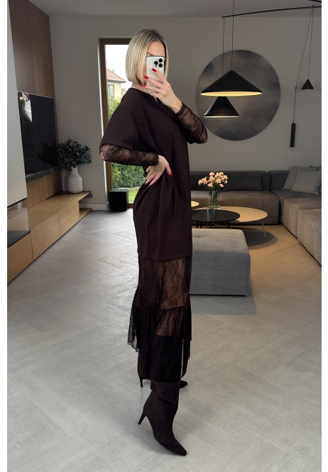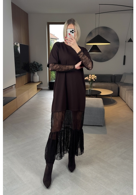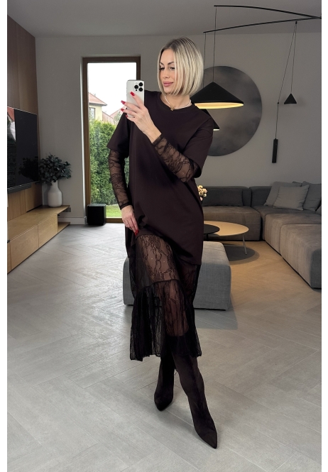 Czarna sukienka maxi, która zachwyca swoją prostotą i klasą. Wykonana z delikatnego, lejącego materiału, pięknie układa się na sylwetce i nadaje jej lekkości. Długie rękawy zakończone subtelną koronką dodają całości romantycznego charakteru, a koronkowy dół sprawia, że sukienka nabiera wyjątkowego, wieczorowego stylu.