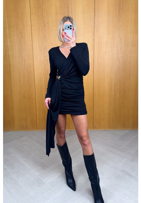 Wyjątkowa sukienka, która podkreśla kobiecą sylwetkę i przyciąga spojrzenia. Model wykonany z elastycznego, miękko układającego się materiału, który pięknie dopasowuje się do ciała. Efektowne marszczenie na całej długości optycznie wysmukla figurę, a ozdobna broszka w talii dodaje szyku i elegancji.