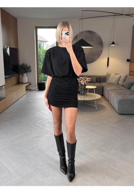 Model o długości mini z delikatnym marszczeniem w dolnej części pięknie podkreśla sylwetkę i dodaje całości wyjątkowego charakteru.