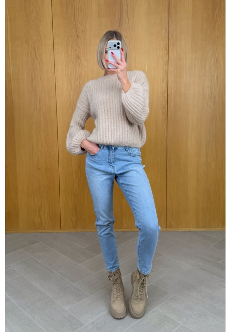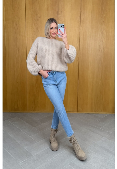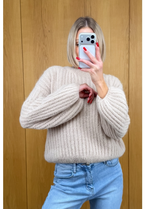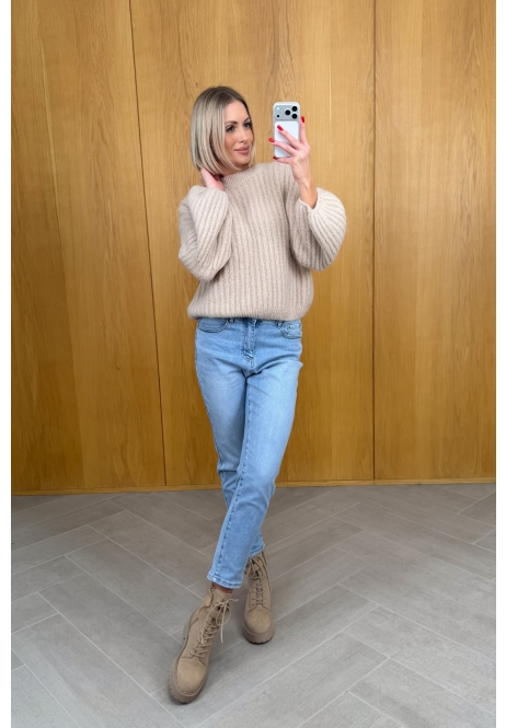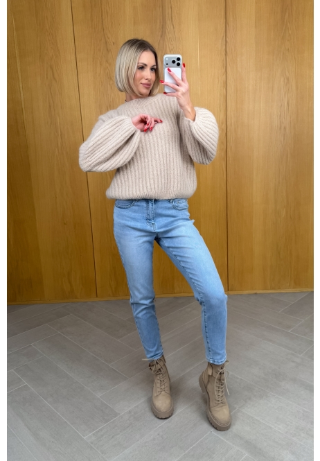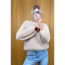 Mięciutka, puszysta dzianina z delikatnym prążkowaniem pięknie układa się na sylwetce, a krótki, modny krój dodaje lekkości całej stylizacji