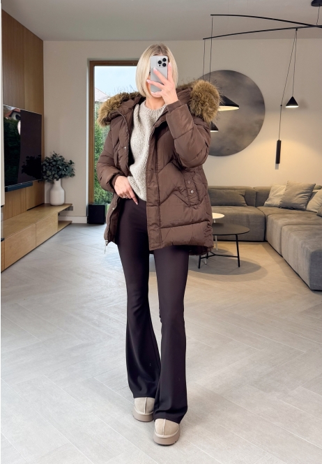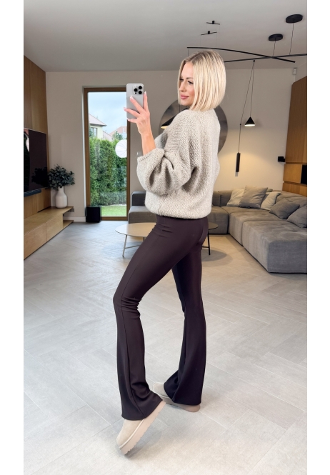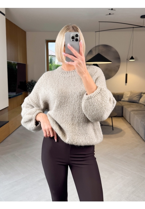 Ten sweter w głębokim, beżowym kolorze to prawdziwa perełka — miękki, puszysty i stworzony z włoską precyzją. Ma luźny krój i lekko bufiaste rękawy, które nadają mu romantycznego, kobiecego charakteru.