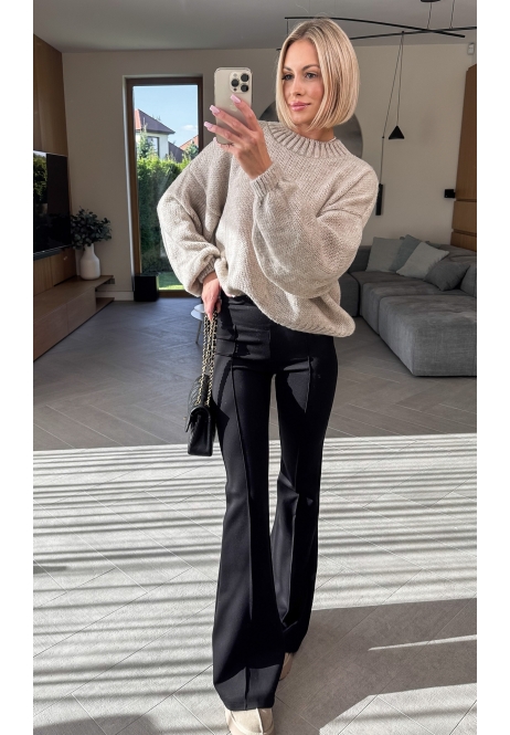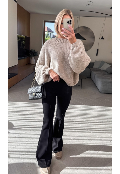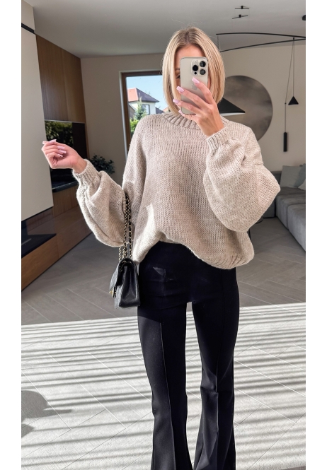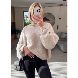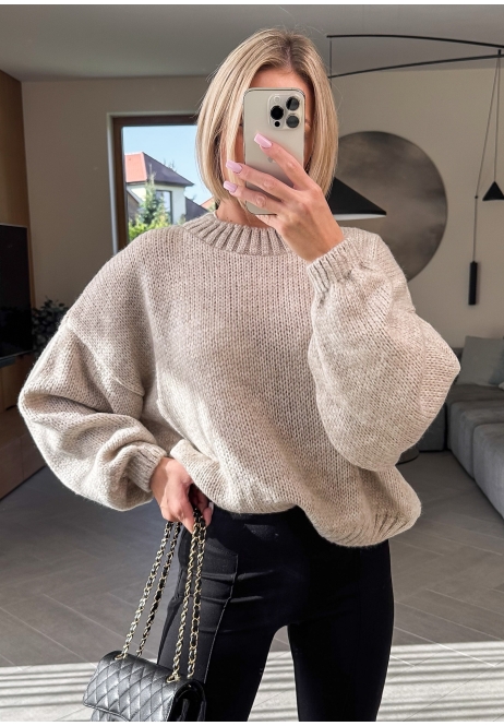 Miękki, oversize’owy sweter w odcieniu jasnego beżu, wykonany z puszystej dzianiny o wyraźnym splocie. Posiada grubszy, prążkowany dekolt typu okrągły oraz dopasowane ściągacze przy rękawach i na dole, które nadają mu formę i wygodę w noszeniu.