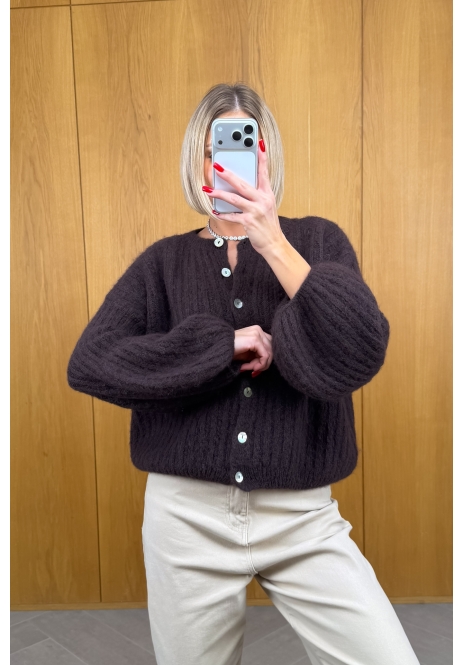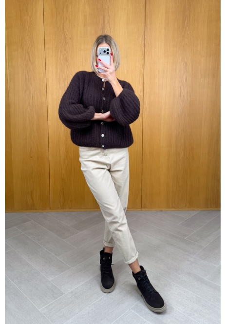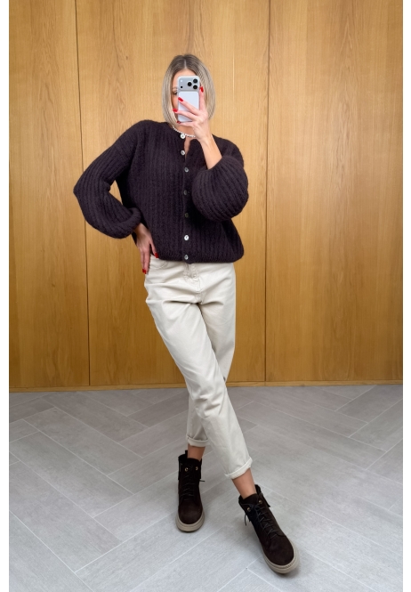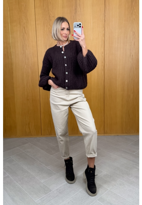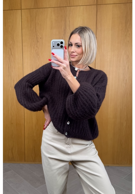 Zapinany na subtelne guziczki, świetnie sprawdzi się zarówno do jeansów, jak i ulubionej spódniczki. To ten typ sweterka, którego nie chcesz zdejmować — lekki, miękki i mega komfortowy.