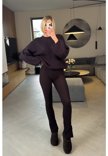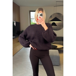 Ten sweter w głębokim, brązowym kolorze to prawdziwa perełka — miękki, puszysty i stworzony z włoską precyzją. Ma luźny krój i lekko bufiaste rękawy, które nadają mu romantycznego, kobiecego charakteru.