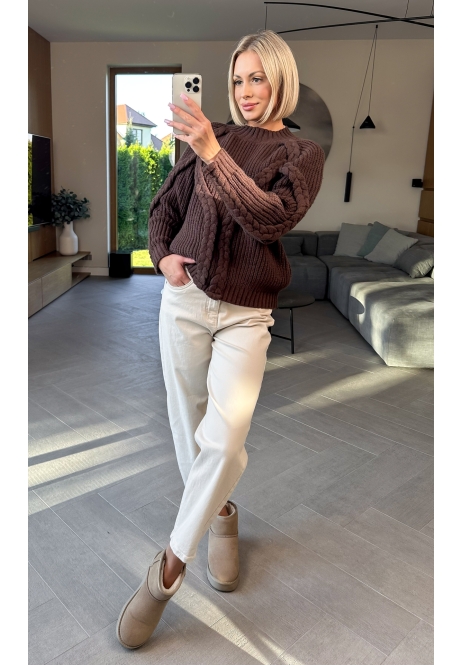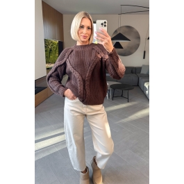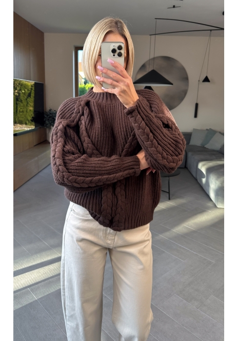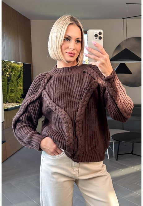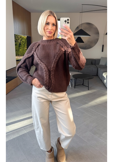 Klasyka, która nigdy nie wychodzi z mody! Ten ciepły sweter w kolorze głębokiego brązu został ozdobiony pięknymi warkoczami, które dodają mu charakteru i elegancji. Miękki, wygodny i niezwykle uniwersalny – sprawdzi się zarówno w casualowych stylizacjach z jeansami, jak i w bardziej kobiecych zestawach ze spódnicą.