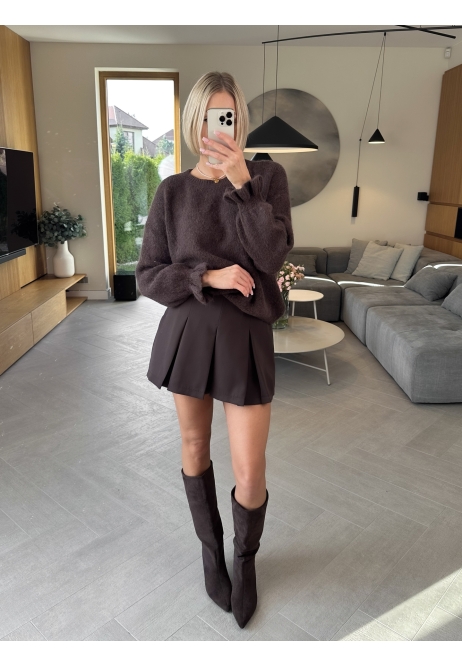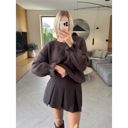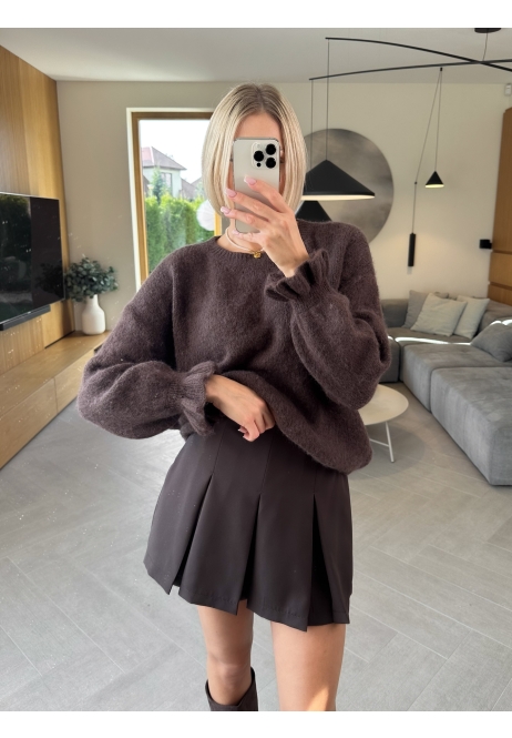 Mięciutki, puszysty sweter w głębokim czekoladowym odcieniu, który od pierwszego dotyku otula jak przytulny wieczór pod kocem.