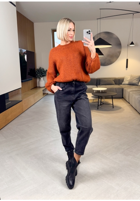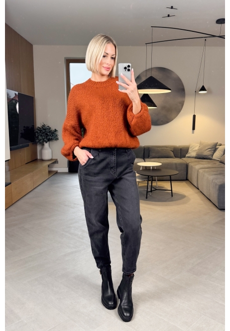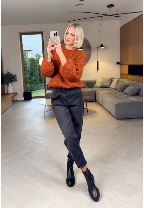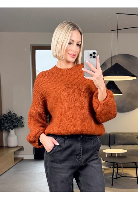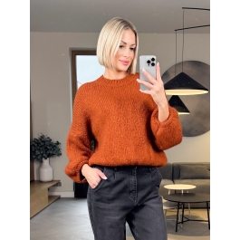 Ten sweter w głębokim, dyniowym kolorze to prawdziwa perełka — miękki, puszysty i stworzony z włoską precyzją. Ma luźny krój i lekko bufiaste rękawy, które nadają mu romantycznego, kobiecego charakteru.