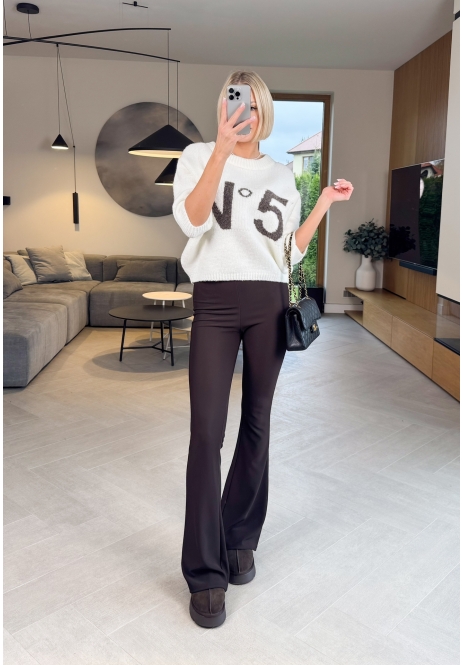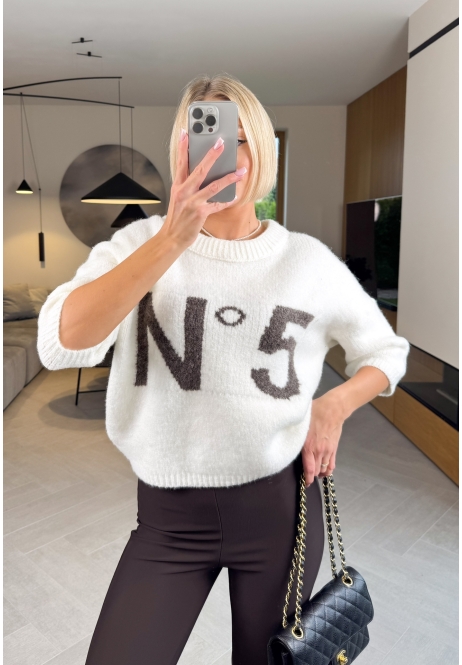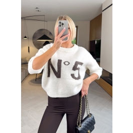 Otul się miękkością i stylem! Nasz kremowy sweterek to idealne połączenie wygody i modowego pazura. Delikatna, puszysta dzianina przyjemnie otula ciało, a kontrastowy napis N°5 dodaje mu charakteru i francuskiej elegancji.