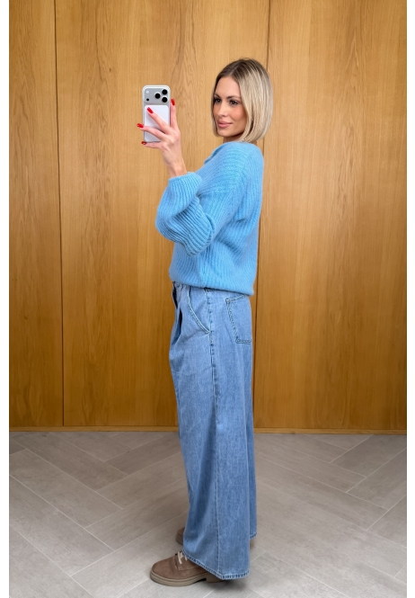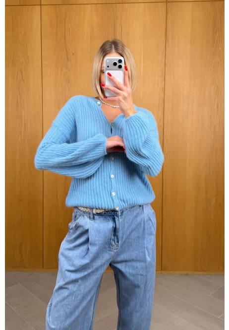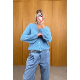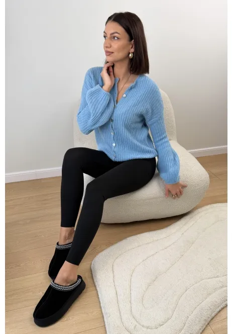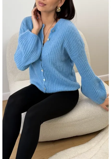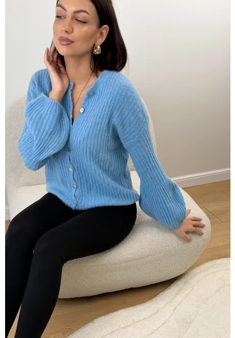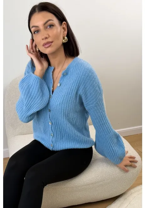Uroczy, miękki kardigan w intensywnym niebieskim kolorze, który pięknie ożywia stylizację i dodaje jej dziewczęcego charakteru. Model wykonany z przyjemnego, prążkowanego materiału, który świetnie dopasowuje się do sylwetki. Zapinany na eleganckie guziki, z klasycznym okrągłym dekoltem i długim rękawem.