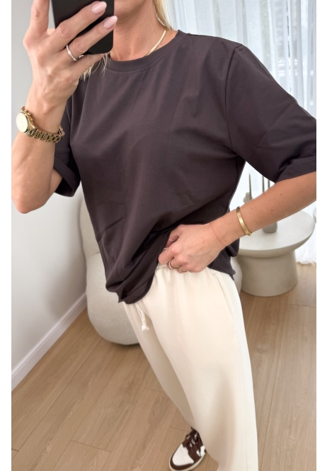 Dostępny na Clothstore.pl T-shirt Taupe Casual to wygodna i stylowa opcja dla kobiet, która łączy prostotę z elegancję. Produkt ten jest idealny zarówno na co dzień, jak i na bardziej oficjalne okazje, dzięki swojej uniwersalności. Wykonany z miękkich i przyjemnych w dotyku materiałów, zapewnia komfort noszenia przez cały dzień. T-shirt w kolorze taupe jest neutralny i łatwy do zestawienia z innymi elementami garderoby, takimi jak jeansy, spódnice czy legginsy, co pozwala na tworzenie różnorodnych stylizacji. Dzięki swojemu klasycznemu fasonowi, jest to produkt, który doskonale wpisuje się w trendy modowe, jednocześnie pozostając praktycznym elementem garderoby.
