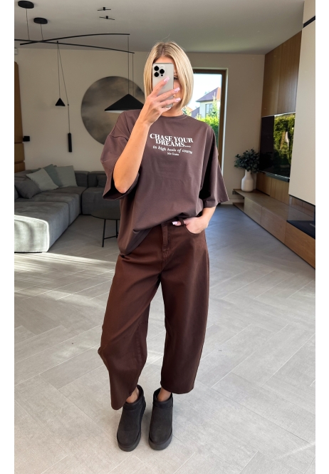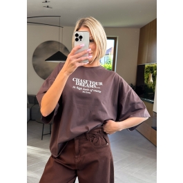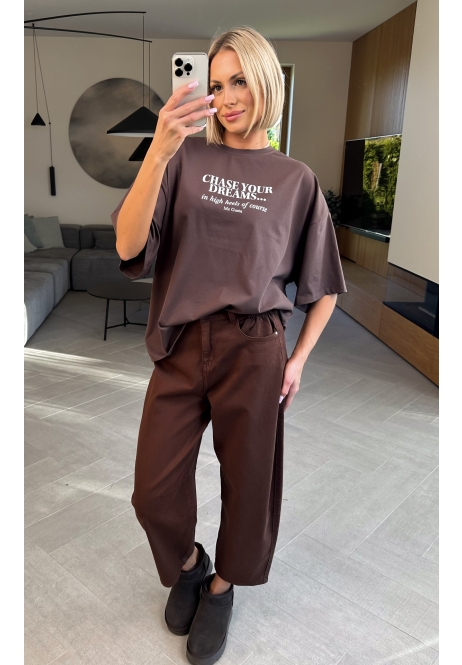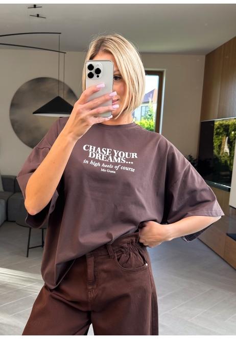 Brązowa koszulka z napisem "CHASE YOUR DREAMS... in high heels of course" to idealny wybór dla kobiet, które kochają styl i pewność siebie.