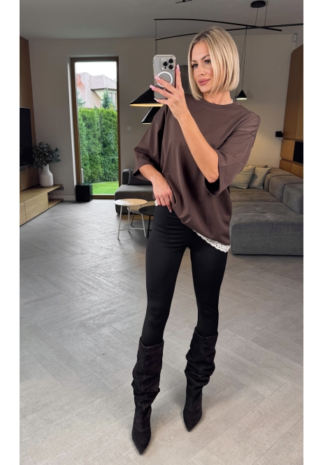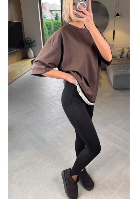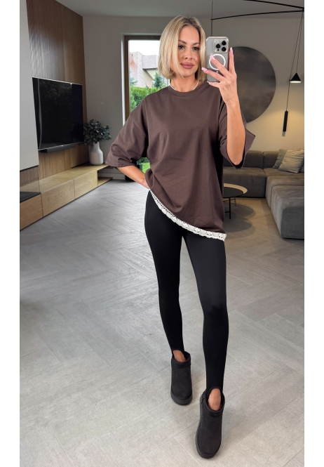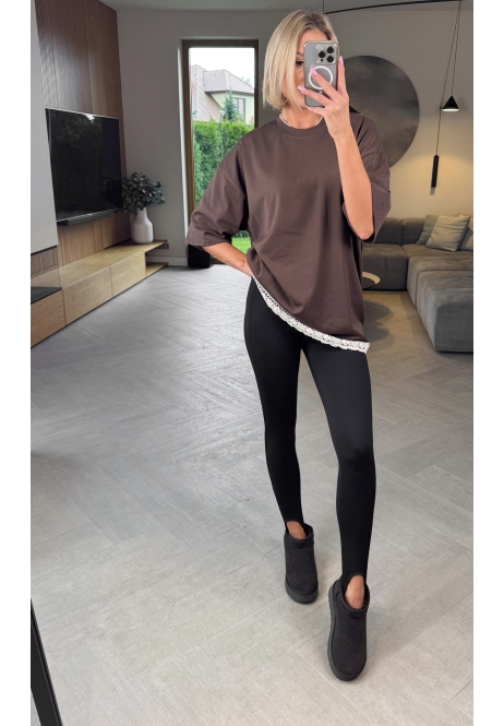 Ten t-shirt to idealne połączenie prostoty i subtelnej elegancji. Wykonany z miękkiej, wygodnej dzianiny w kolorze głębokiego brązu, wyróżnia się pięknym detalem – delikatną koronką w kolorze ecru wszytą na dole.