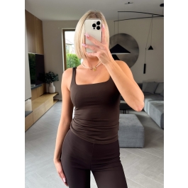 Ten brązowy top bez rękawów to uniwersalna baza każdej stylizacji. Wykonany z miękkiej, oddychającej tkaniny, idealnie dopasowuje się do sylwetki, zapewniając komfort przez cały dzień. Zaokrąglony dekolt dodaje mu kobiecego charakteru, a prosty fason sprawia, że świetnie sprawdzi się zarówno solo, jak i pod marynarkę, kardigan czy jeansową kurtkę.